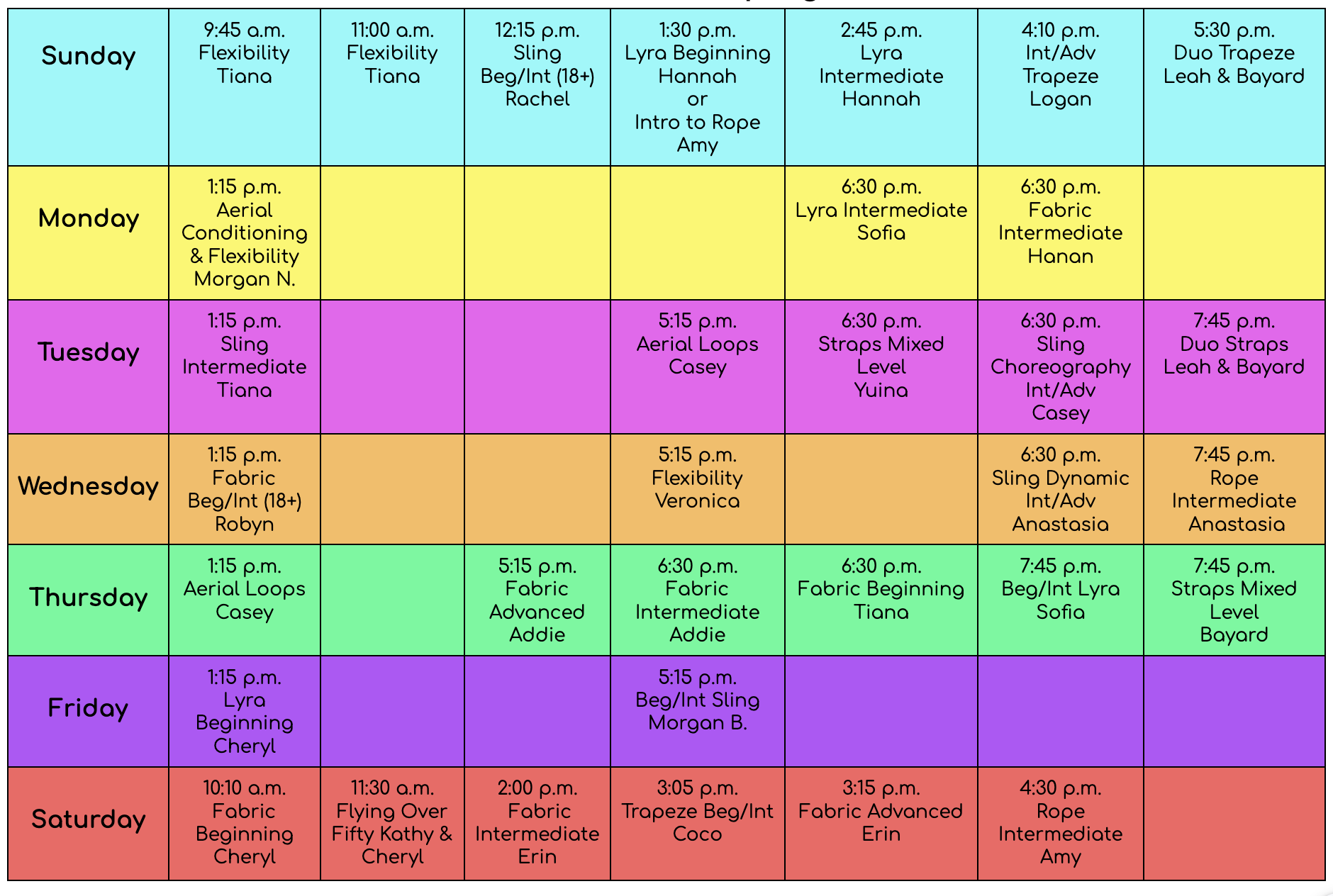 This class is for anyone that is looking to learn aerial sling/hammock skills.Learn beginning to advanced skills, sequences, drops, poses, and descents on aerial sling/hammock. With the small class size you will get individualised attention to so you can progress at your own pace. This class will also help to build strength, flexibility, technique and style. Wednesday & Friday class is ages 16+ (12+ with instructor approval). Some aerial experience recommended but not necessary.