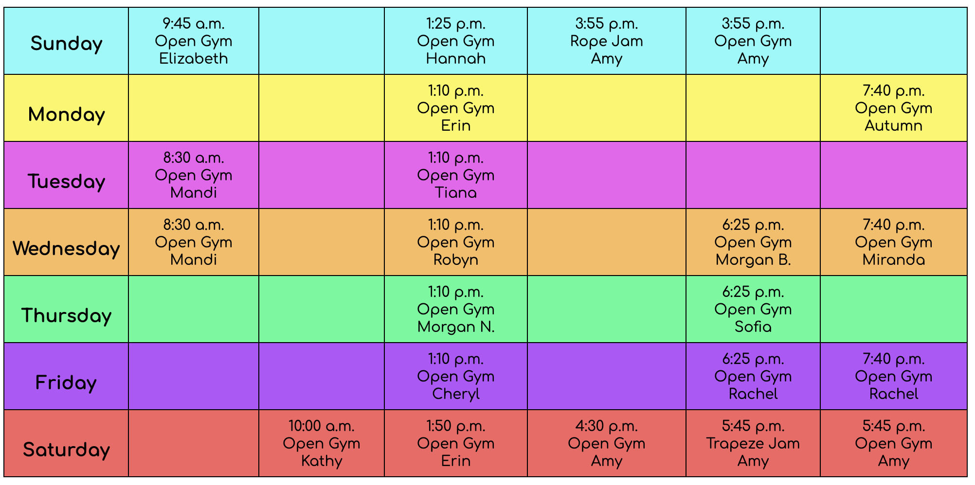 -We will provide apparatuses for open gyms or you can bring your own. Please arrive 5 minutes early. All sessions are 70 minutes. You can warm up while your apparatus is rigged.